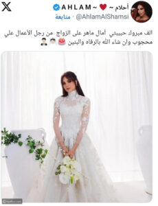 كانت الفنانة الإماراتية أحلام من أبرز وأوائل المهنئين لآمال ماهر. حيث نشرت أحلام عبر حسابها الرسمي على منصة “إكس” (تويتر سابقاً)، صورة لآمال ماهر بفستان زفاف أنيق، وأرفقتها برسالة تهنئة مليئة بالود:
