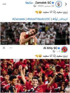 وفي لفتة طريفة ومثيرة للجدل عبر منصات التواصل الاجتماعي، استعانت الصفحة الرسمية للنادي الأهلي بالإشادة الشهيرة التي كانت تطلقها صفحة نادي الزمالك على نجمها السابق أحمد سيد زيزو. حيث كتبت صفحة الأهلي: “زيزو سعيد إذن أنا سعيد“، وهي الرسالة التي كانت تُكتب عندما يتألق زيزو في صفوف القلعة البيضاء.