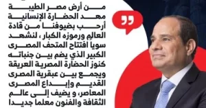 وأوضح الرئيس أن المتحف الجديد “يجمع بين عبقرية المصري القديم وإبداع المصري المعاصر، ويضيف إلى عالم الثقافة والفنون معلماً جديداً، يلتف حوله كل مهتم بالحضارة والمعرفة، ويفخر به كل مؤمن بوحدة الإنسانية وقيم السلام والمحبة والتعاون بين الشعوب”.