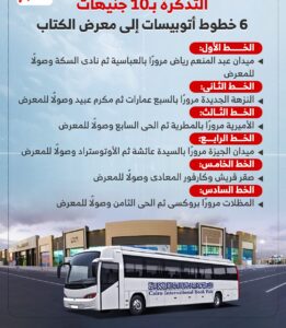 وسيلة النقل: أتوبيسات هيئة النقل العام (تحمل شعار معرض الكتاب).