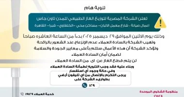 وطمأنت الشركة عملاءها بعدم الانزعاج في حال الشعور برائحة الغاز خلال فترة الأعمال، مؤكدة أن الصيانة ستُجرى وفق أعلى معايير الجودة والسلامة، بما يضمن أمان المواطنين. وأوضحت «تاون جاس» أنه لن يتم قطع خدمة الغاز عن العملاء أثناء تنفيذ الأعمال.