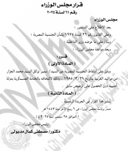 أصدر مجلس الوزراء، برئاسة الدكتور مصطفى مدبولي، القرار رقم 61 لسنة 2025، والذي يقضي بإسقاط الجنسية المصرية عن شخص يُدعى سمير توكل السيد محمد الجزار.