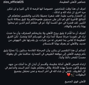 وكتب زيزو عبر صفحته في انستجرام: “اعرف ان هذا وقت للشامتين خصوصا انها فرصه لا تأتي كثيرا و لن تتكرر مره اخري ان شاء الله و لذلك، إن الاعتذار واجب علينا، فقد شعرنا جميعًا بالذنب والتقصير تجاهكم في النتائج الأخيرة التي لم تكن على مستوى طموحاتكم ولا تليق بمكانة نادينا الكبير. لقد قصّرنا في حق أنفسنا أولًا، ثم في حقكم أنتم الذين لم تبخلوا يومًا بالدعم والوفاء.” وأضاف: “أعترف أن ما قُدِّم لا يليق بروح الأهلي ولا بتاريخكم المشرّف، وأن ما حدث ترك في نفوسنا جرحًا عميقًا كما ترك في نفوسكم ألمًا وغضبًا. لكنّ الفرق العظيمة لا تُقاس بما تتعرض له من عثرات، بل بقدرتها على النهوض من جديد، والأهلي لم يعرف يومًا الاستسلام.” وواصل :”أعدكم أن هذا التقصير لن يتكرر، وأن المرحلة القادمة ستكون ردًّا عمليًا يليق بكم ويعيد الأهلي إلى موقعه الطبيعي في الصدارة، منافسًا على كل بطولة، مصدرًا للفخر دائمًا وأبدًا.” وختم :ارتداء قميص الأهلي أمانة عظيمة، وأقسم أن أبذل كل ما أملك من جهد وعرق لأكون جديرًا بهذه الأمانة، ولأفي بحقكم علينا، أنتم السند والداعم في كل الظروف. نلتقي ان شاء الله في آخر السنه و نحن نحتفل بجميع البطولات.”