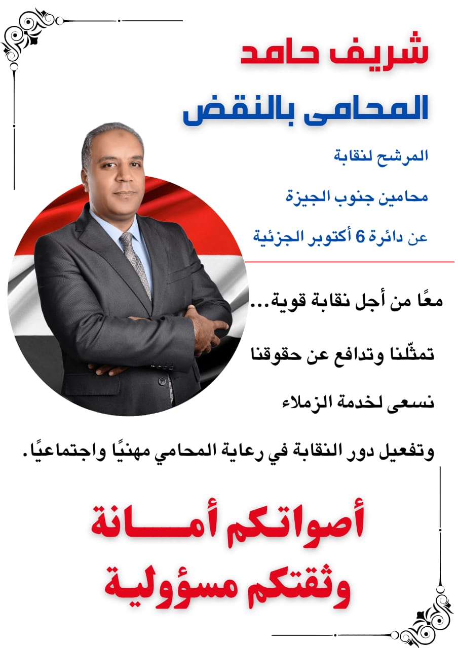 أعلن شريف حامد، المحامي بالنقض والمرشح لعضوية نقابة المحامين بجنوب الجيزة عن دائرة 6 أكتوبر الجزئية، ملامح برنامجه الانتخابي، خلال لقاء موسّع مع عدد كبير من المحامين بنقابة محامين ٦ أكتوبر، حيث أكد أن أولويته الرئيسية هي خدمة المحامين على أرض الواقع، وليس الاكتفاء بالشعارات أو الوعود.