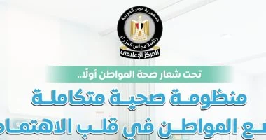نشر المركز الإعلامي لمجلس الوزراء مجموعة من الرسوم البيانية (إنفوجرافات) التي تسلط الضوء على الجهود المبذولة لتطوير المنظومة الصحية في مصر تحت شعار “صحة المواطن أولاً”. وتؤكد هذه الجهود التزام الدولة بتحقيق التغطية الصحية الشاملة وتحسين جودة الخدمات، وضمان عدالة الحصول على الرعاية الصحية.