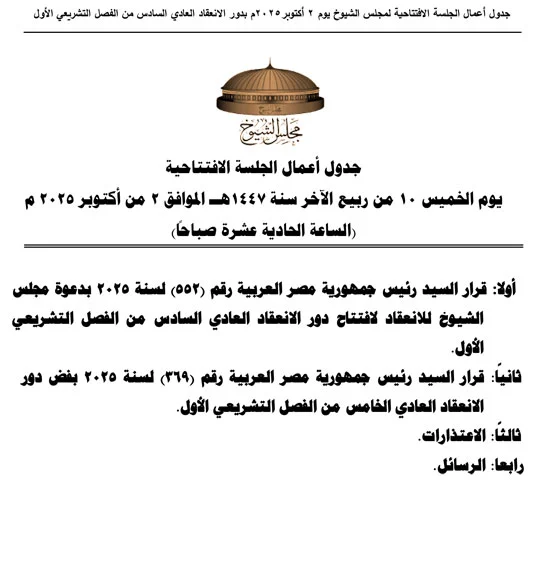 يعقد مجلس الشيوخ برئاسة المستشار عبد الوهاب عبد الرازق، غدًا الخميس، الجلسة الافتتاحية لدور الانعقاد السادس من الفصل التشريعي الأول.