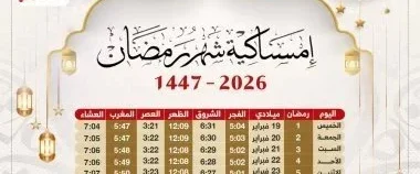 كشفت إمساكية شهر رمضان لعام 1447 هـ (2026 م) عن مواعيد السحور والإفطار وعدد ساعات الصيام، حيث من المتوقع أن يكون رمضان هذا العام 29 يوماً. وفقاً للحسابات الفلكية، يبدأ أول أيام شهر رمضان الخميس 19 فبراير 2026 (الموافق 1 رمضان)، وهو اليوم الذي يشهد أقل ساعات صيام، حيث ستكون مدة الصوم 13 ساعة و2 دقيقة. بينما سيكون آخر أيام رمضان، الخميس 19 مارس 2026 (الموافق 29 رمضان)، هو أطول أيام الصيام في هذا الشهر، حيث تصل ساعات الصوم إلى 13 ساعة و52 دقيقة.