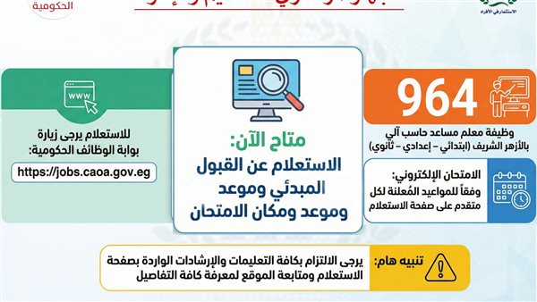 أعلن الجهاز المركزي للتنظيم والإدارة برئاسة المهندس حاتم نبيل عن إتاحة الاستعلام عن القبول المبدئي وموعد ومكان إجراء الامتحان الإلكتروني للمتقدمين لشغل 964 وظيفة معلم مساعد حاسب آلي للمراحل التعليمية الابتدائية والإعدادية والثانوية بالأزهر الشريف، وذلك من خلال موقع بوابة الوظائف الحكومية